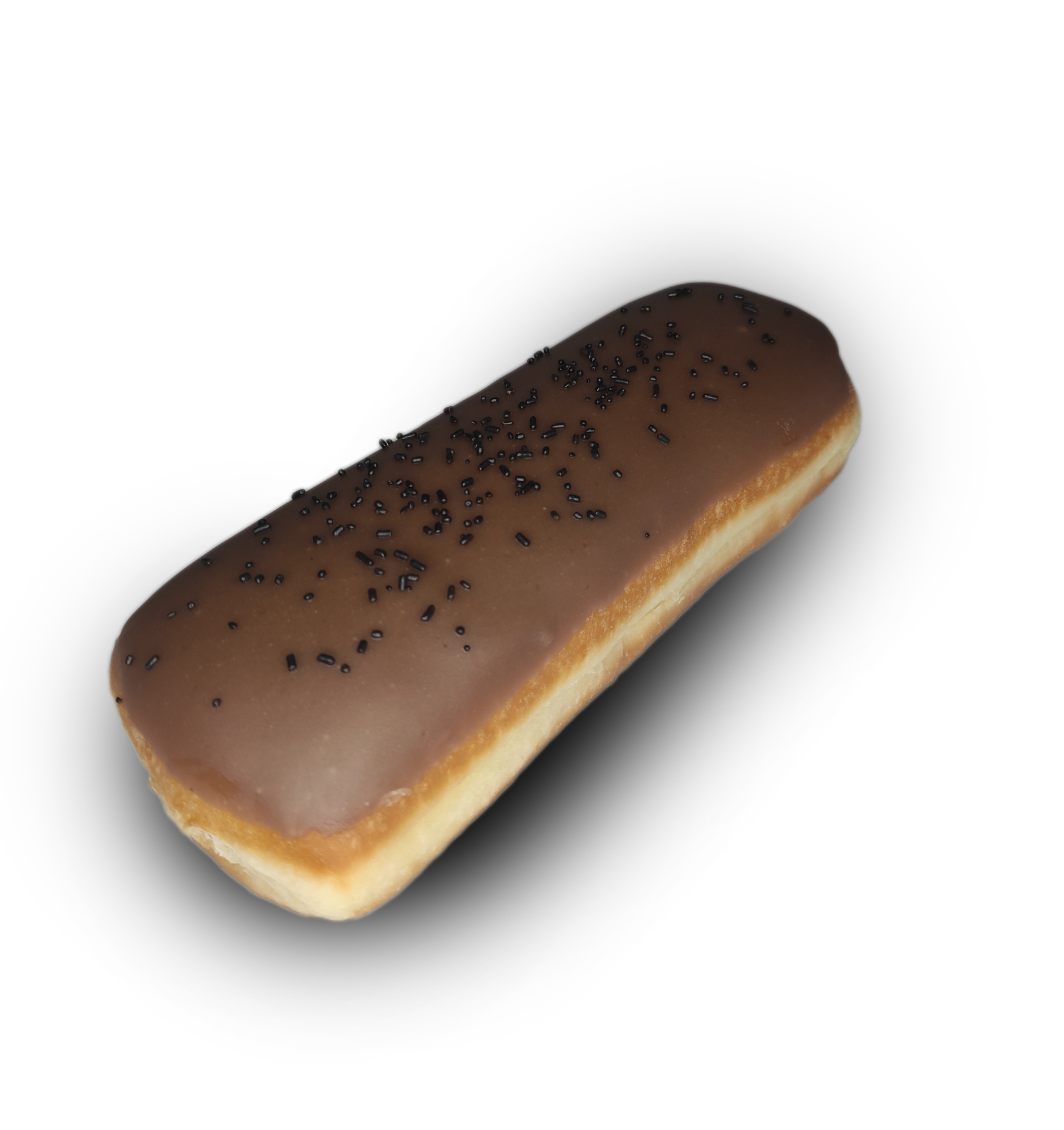 Donut σε σχήμα Εκλαιρ, γλασαρισμένο με γλάσο σοκολάτας, τρούφα σοκολάτας και γέμιση πραλίνας φουντουκιού.